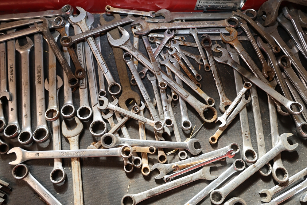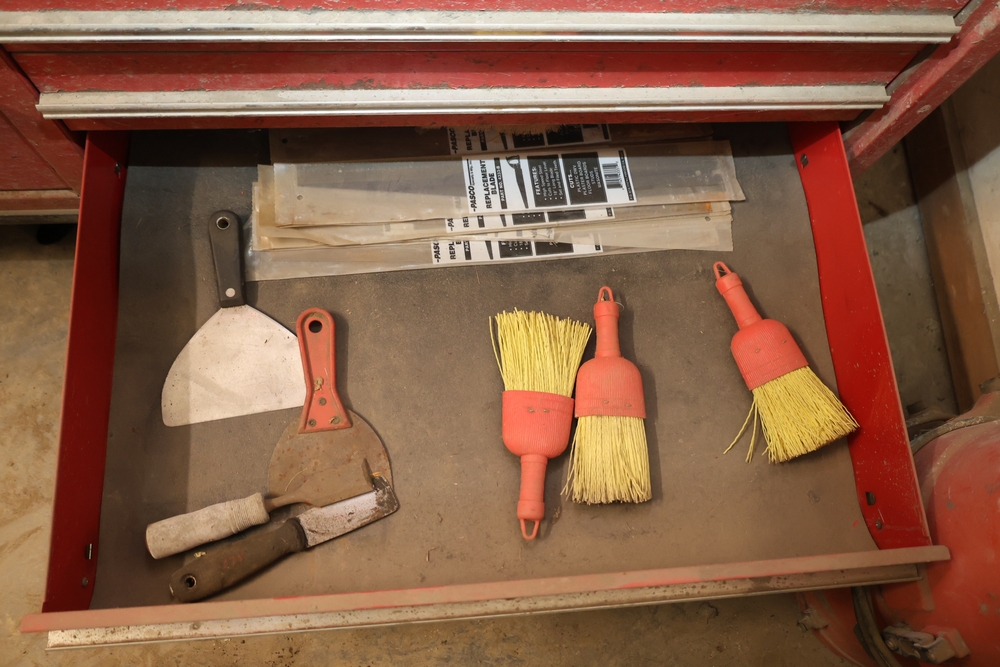 Matco rolling tool chest with multiple drawers, assorted sockets, socket trays, wrenches, pry bars, pliers, screwdrivers, hex keys, and miscellaneous hand tools; approximately 53 inches wide, 24 inches deep, and 40 inches tall.