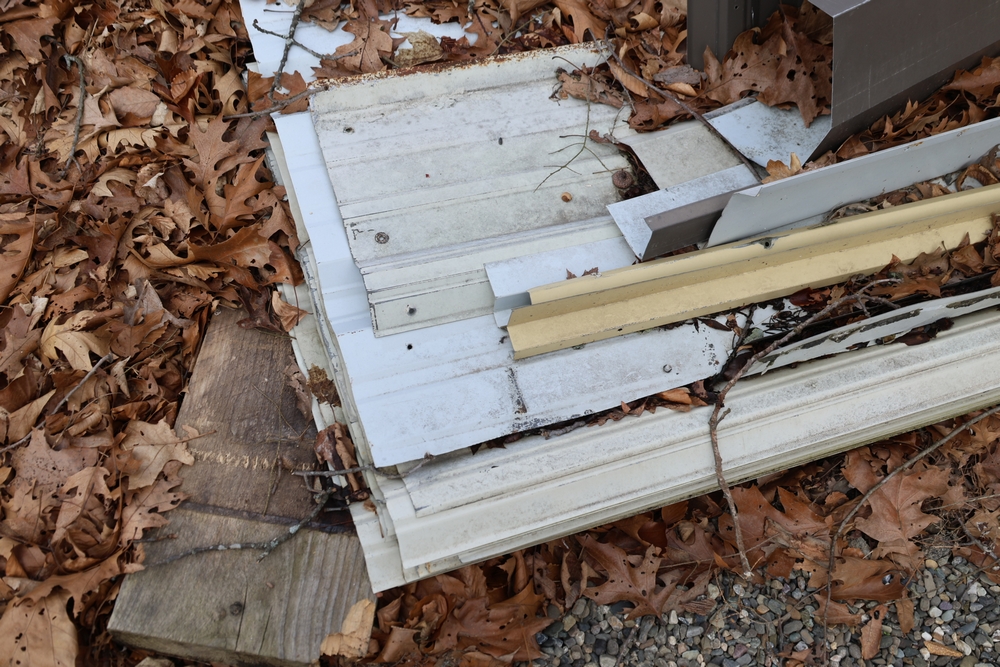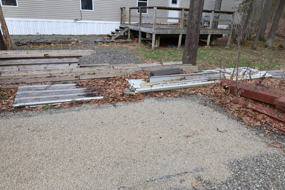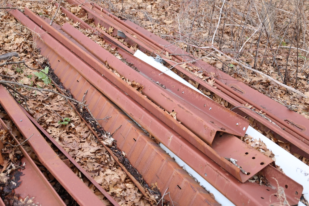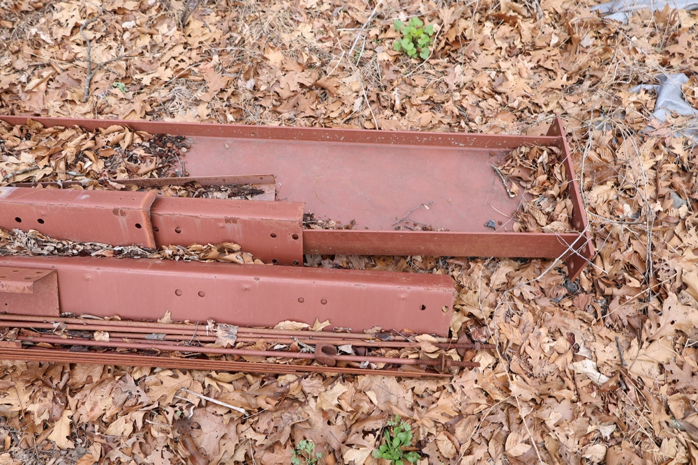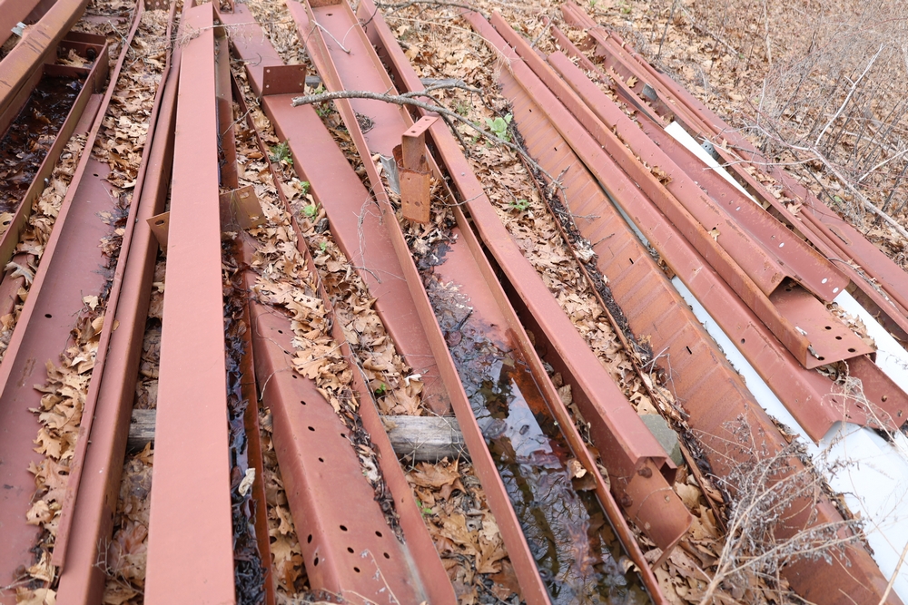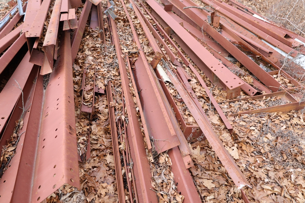 Structural steel components and metal panels from 30 ft x 50 ft building, including red painted beams, posts, and framing members with pre-drilled connection holes; additional galvanized and painted metal panels and trim pieces; mixed lengths and profiles.