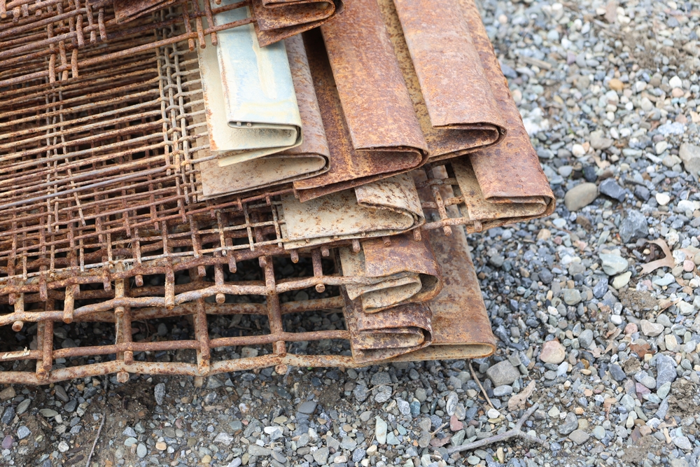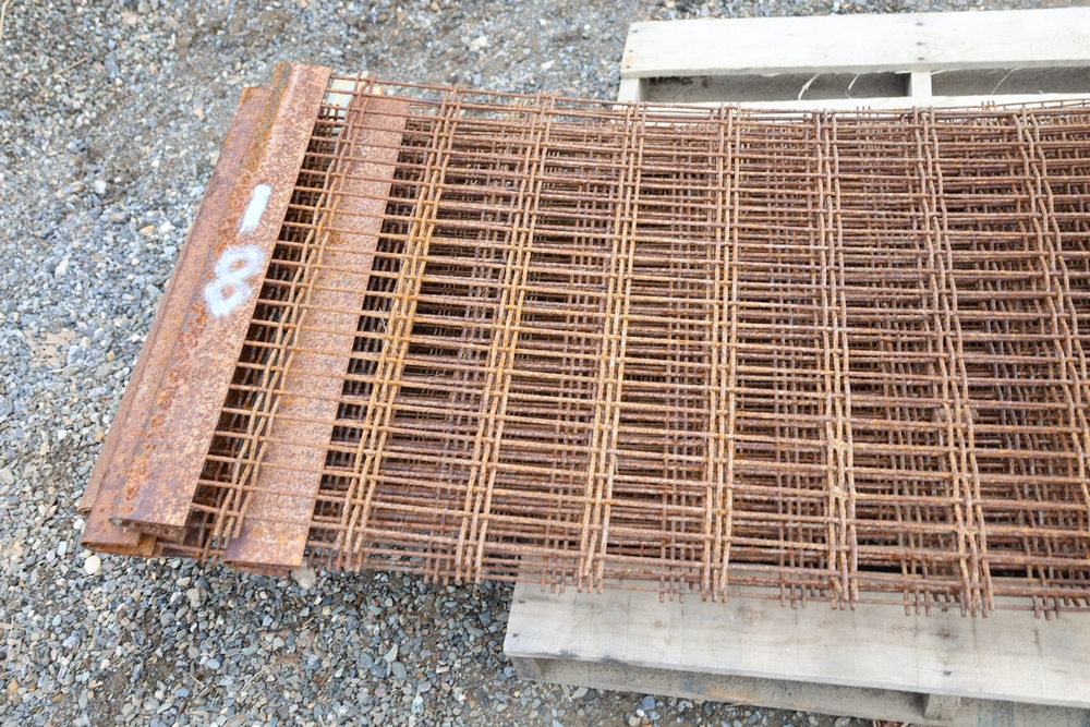 Stack of steel grating panels with welded wire grid construction; label indicates Eastern Processing Equipment with part number sm211A and size marked 83-3/4 in x 27-5/8 in; seller reports: for use with Extec screener.