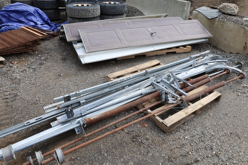Mixed lot of metal door hardware including rails, brackets, springs, and pulleys; includes eight panels measuring approximately 9 ft wide by 2 ft.