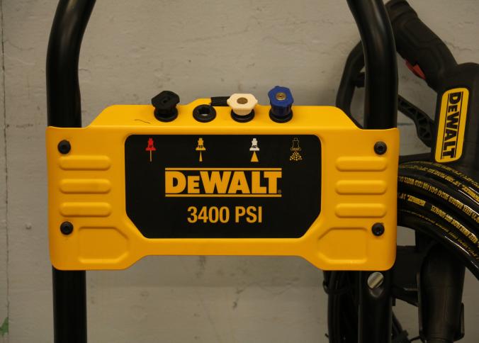 DeWalt 3400 PSI gas-powered pressure washer, Model DXPW616372, with a 2.5 GPM flow rate. Features a robust design with a yellow and black frame, large wheels for mobility, and an ergonomic spray wand. Equipped with detergent capability for efficient cleaning. Includes hoses and attachments. Pickup only.