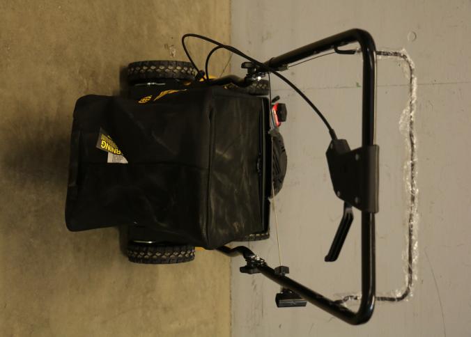 DeWalt RWD gas-powered lawn mower, Model 12A-01T9739, equipped with a 150cc Briggs & Stratton engine delivering 6.25 ft. lbs. gross torque. Features include rear-wheel drive for enhanced traction, a sturdy yellow steel deck, and a black grass collection bag. Includes a padded handle and safety controls. Pickup only.