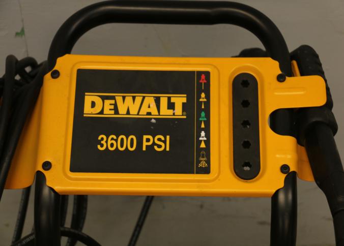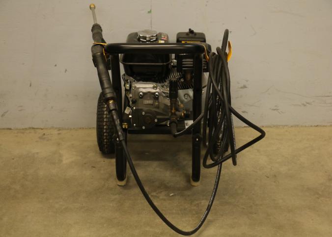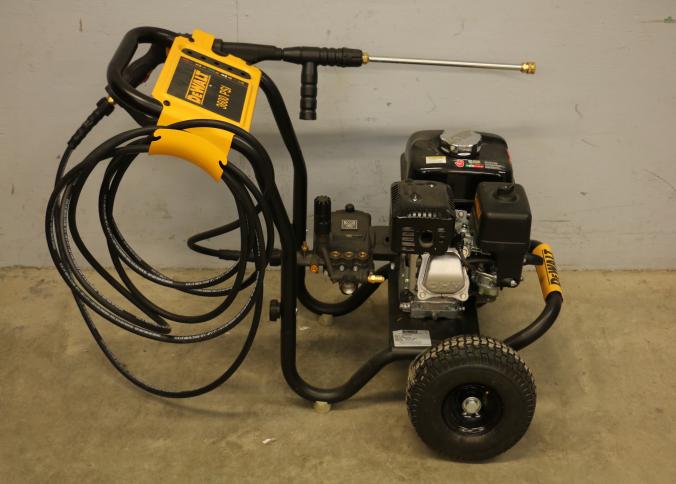 DeWalt 3600 PSI Gas Pressure Washer, Model DXPW61299. Features a Honda engine, hose, trigger handle, and spray wand. Includes large tires for mobility and a steel frame for durability. Rated for 2.5 gallons per minute. Pickup only.