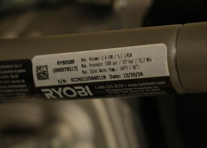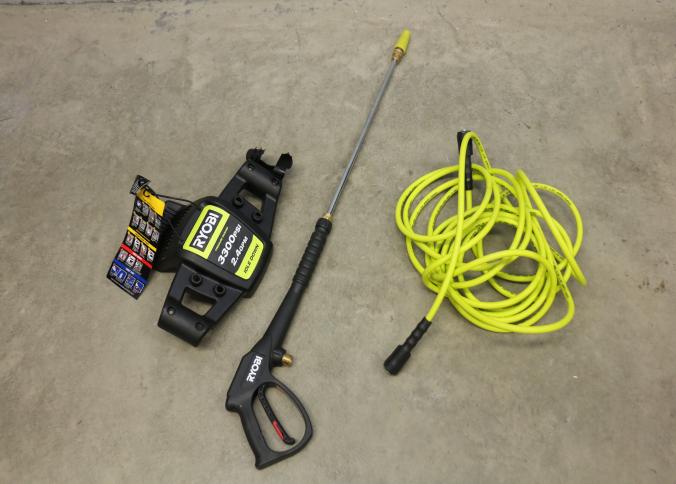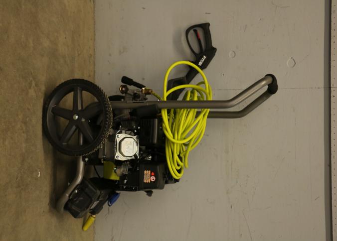 Ryobi gas pressure washer rated at 3300 PSI and 2.4 GPM, Model RY80589, including wand and hose. Features idle-down technology, a durable steel frame, and a high-pressure hose. Includes user-friendly controls, large wheels for ease of mobility, and an ergonomic spray wand. Pickup only.