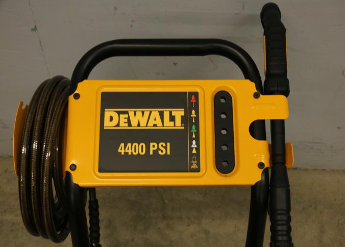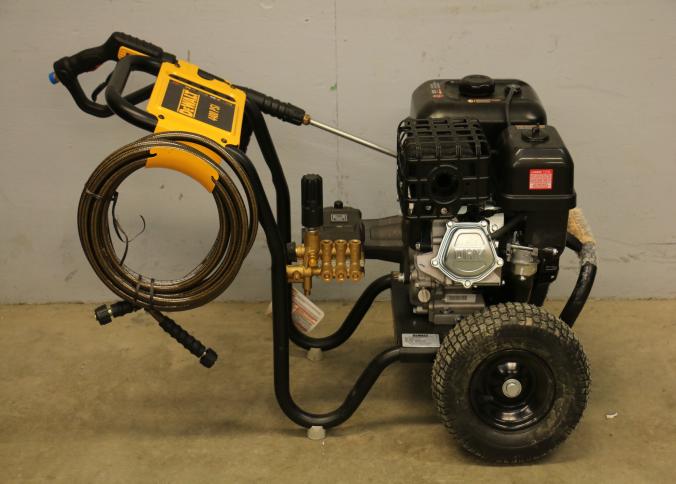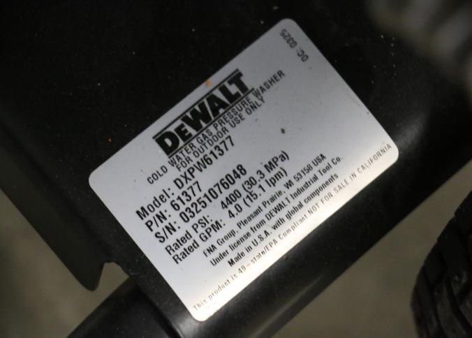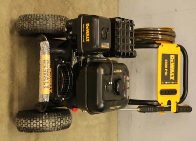 DeWalt 4400 PSI Gas powered pressure washer, Model DXPW61377. Specifications include a 4.0 GPM flow rate and a rated engine speed of 3400 RPM. Includes a metal frame with rubber tires, a hose, and a spray gun. Hardware not included. Unit has compression, but does not start. Pickup only.