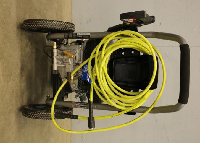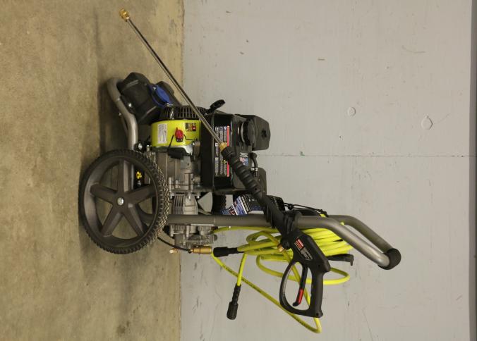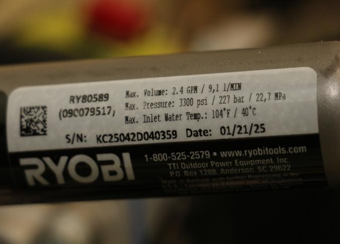 Ryobi gas-powered pressure washer, Model RY80589, featuring a maximum pressure of 3300 PSI and a maximum flow rate of 2.4 GPM. Includes durable wheels, hose, spray wand, nozzle, and ergonomic handle. Designed for outdoor cleaning applications. Pickup only.