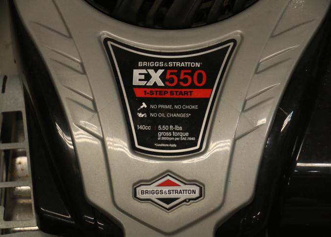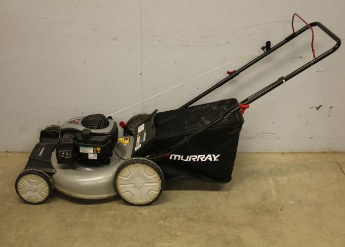 Murray 21-Inch Lawn Mower, Model MNA152703 featuring a Briggs & Stratton EX550 engine with 140cc and 5.50 ft-lbs of gross torque. Includes a 21-inch cut width and a rear discharge bag. Designed with a manual push system, durable wheels, and easy-use handle with control cables. Pickup only.