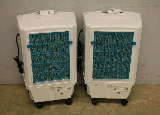 Two Bonaire Hi Flo 450 CFM Portable Evaporative Air Coolers with Remote, Model CDU6280064. Features adjustable control panel, remote control, and a removable filter. Built-in casters for mobility and designed for efficient cooling. Includes original remote controls and instructions. Pickup only.