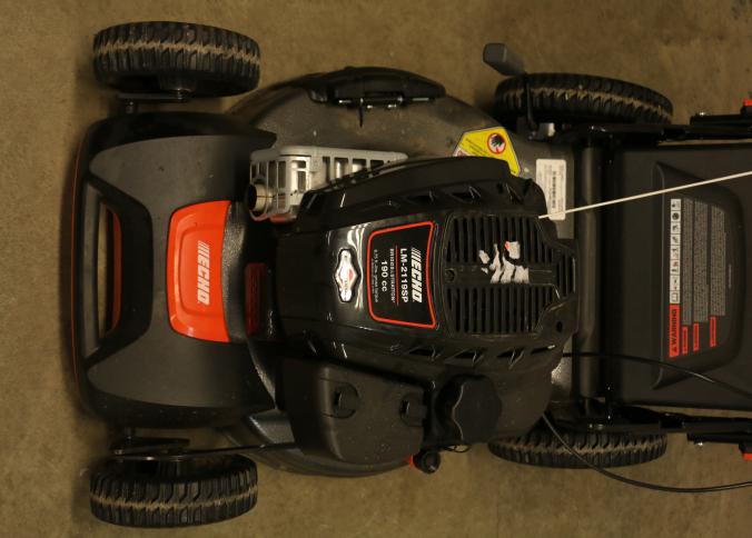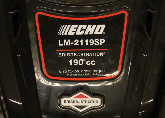 Echo 21-Inch Self-Propelled Gas Lawn Mower, Model LM-2119SP, featuring a 190cc Briggs & Stratton Engine and rear bagger for grass collection. Includes a steel deck, adjustable cutting height, and ergonomic handle design. Pickup only.