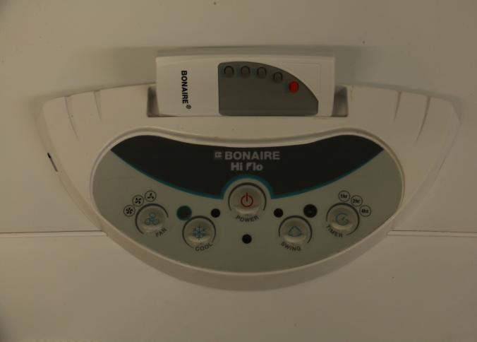 Bonaire Hi Flo 450 CFM Portable Evaporative Air Cooler with Remote, Model CDU6280064. Features an adjustable control panel, remote control, and a removable filter for easy maintenance. Includes rolling casters for portability. Operates on 110-120V, 60Hz, with a power consumption of 0.55A. Pickup only.