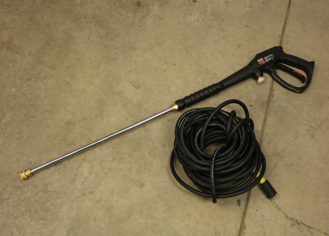 Ryobi gas pressure washer, Model RY80589, featuring a maximum pressure of 3300 PSI and a flow rate of 2.4 GPM. Includes a durable two-wheel frame, hose, and spray gun attachment. Designed for efficient cleaning tasks. Pickup only.