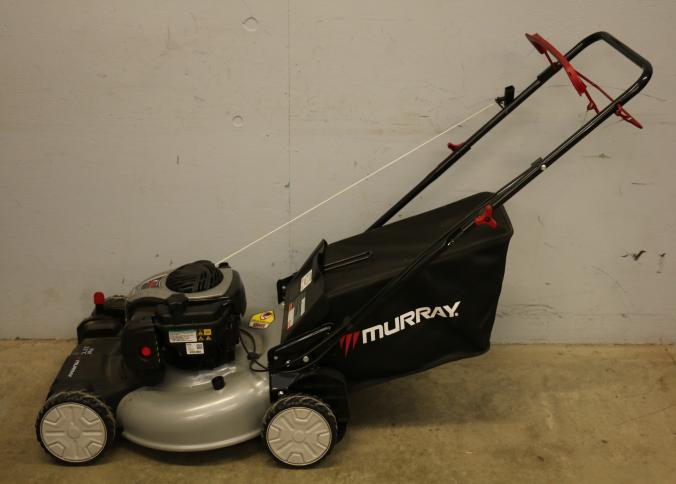 Murray 22-Inch Lawn Mower, Model MNA153003, with Briggs & Stratton Engine. Features a 22-inch cutting width, 140cc E550 Prime Briggs & Stratton engine, and a rear grass collection bag. Includes forward-wheel drive and manual height adjustments. Hardware not included. Pickup only.