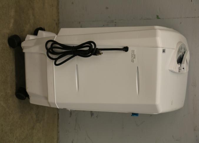 Bonaire Hi Flo 450 CFM Portable Evaporative Air Cooler with Remote, Model CDU6280064. Features an adjustable control panel, remote control, and a removable filter. Designed for efficient cooling and mobility with built-in caster wheels and a compact design. Thermally protected and conforms to UL STD 507. Pickup only.
