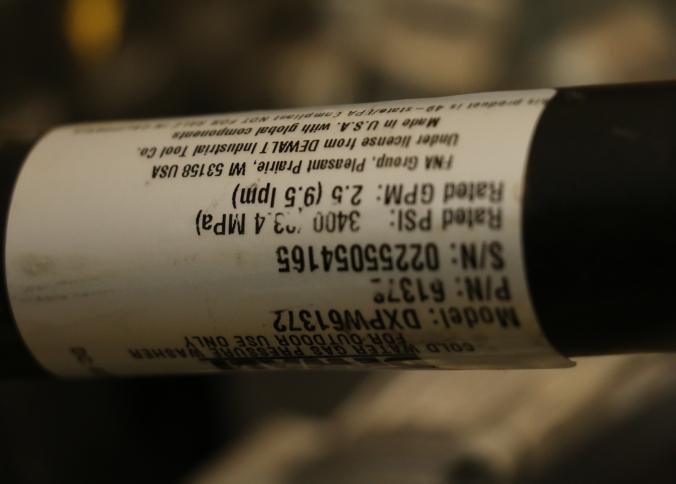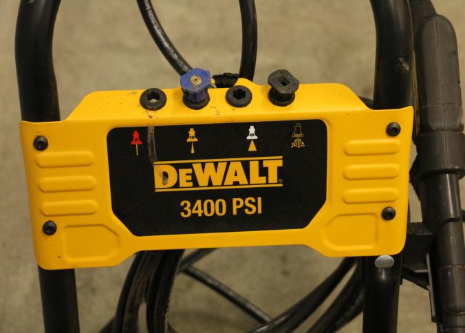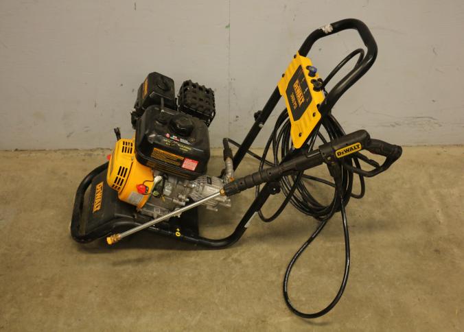 DeWalt 3400 PSI Gas-Powered Pressure Washer with Hose and Wand. Includes a gas engine and hose assembly designed for high-pressure water cleaning. The unit features a prominently labeled 3400 PSI rating on the frame. Wheels not included. Unit has compression but does not start. Pickup only.