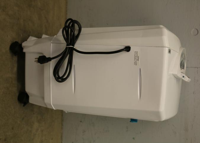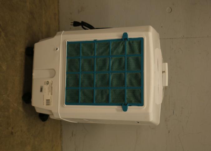 Bonaire Hi Flo 450 CFM Portable Evaporative Air Cooler, Model CDU6280064. Features an adjustable control panel, a remote control, and a removable rear air filter for ease of maintenance. Includes caster wheels for mobility and a convenient cord storage option. Pickup only.