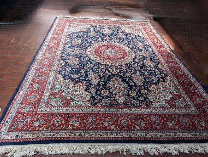 Area Rug. Approx 9'x12' fringed area rug. See photos for pattern and cond. No stains noticed (see back photos).