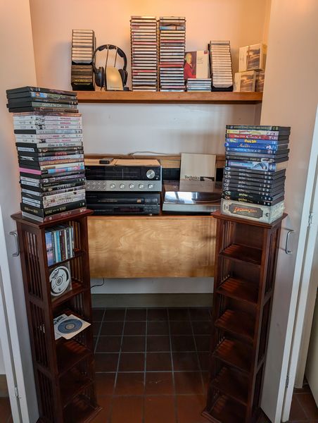 Electronics, Music, Movies. Harman/Kardon 730 receiver; Technics turntable; Denon CD player; Sennheiser headphones; Visio TV, model E241i-A1; pr wood CD stands, ea. 10"Wx8"Dx40"H; lg assort record albums (various genres, incl classical, rock, instrumental, others) some in leather book; guided meditation cassettes (entire box not shown); movies (several series); music CDs.