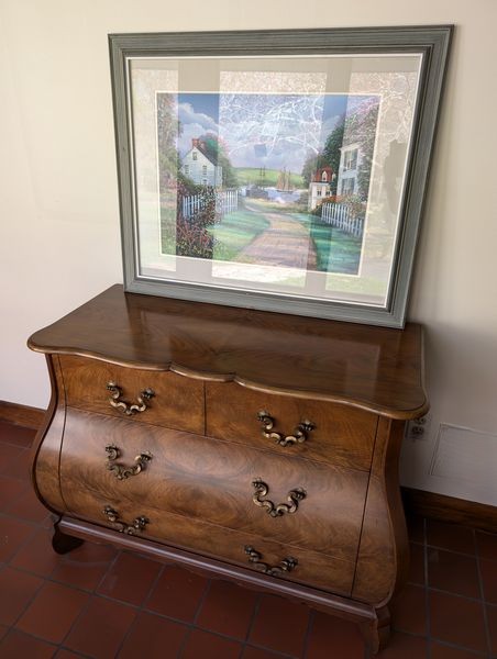 Bombay Chest, Wall Art. Baker Bombay chest (burled wood), 40"Wx20"Dx30"H with three dovetailed drawers (very minor damage to one leg-see photo); signed framed wall art behind glass, 34"Wx29"H.
