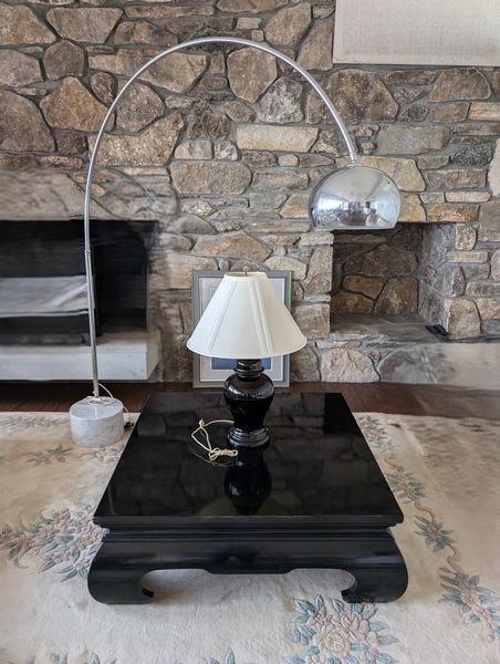 Contemporary Table, Lamp, Art. Black lacquer coffee table, 43"sq x15"H; modern gooseneck floor lamp (1'diameter base), approx. 76"H; sailboat framed wall art, 29"Wx35"H; black jar-style table lamp, 31"H.
