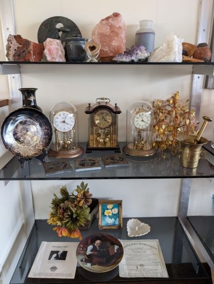 Clocks, Collectibles. Three mantle clocks (see photos for names), ea. approx. 9"H; Asian-style vase, 11"H; brass mortar & pestle; Norman Rockwell collector's plate with auth, 8.5"diameter; other collectibles as seen on shelves.