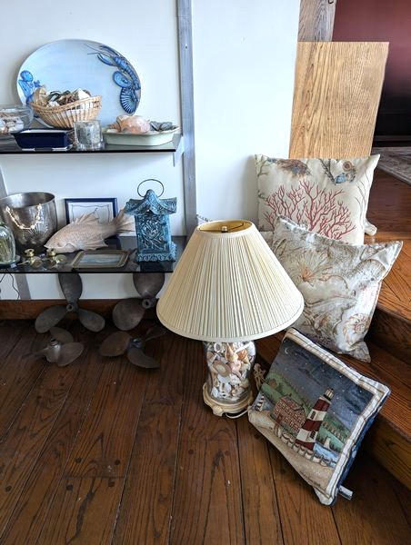Beach-Themed Décor. Blue lobster platter made in Italy, 20"Lx14"W; shell-filled table lamp with shade, 29"H; brass propellers, largest 15"diameter; throw pillows; other related items as seen in photos.