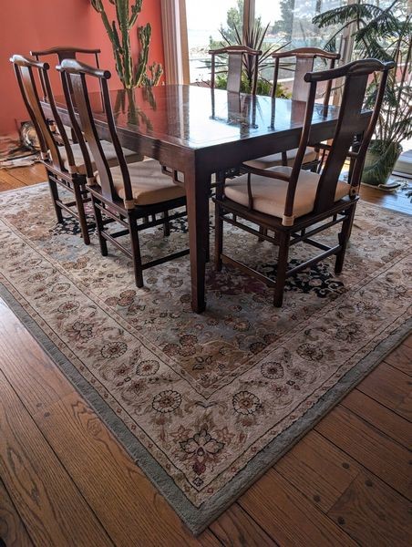 Baker Dining Table, Chairs, Area Rug. Baker dining table, 69"Lx46"Wx29.5"H plus two 2' ea. table inserts; set of 6 chairs (two arm, ea. 21.5"Wx19"Dx40"H & four side, ea. 19"Wx19"Dx40"H - note back of one side chair has mark); machine-made area rug, 8'x10'. See photos. Plants and other items seen in background not incl.