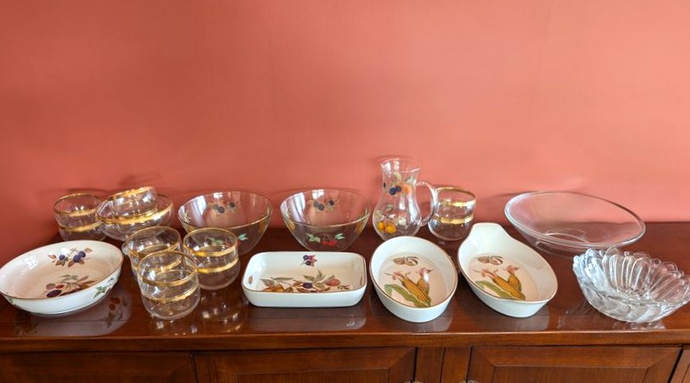 Entertaining, featuring Evesham. Evesham Royal Worcester entertaining pieces, incl: handled platter, 14"L; oval platter, 12.5"L; two bowls, ea. 9"diameter; round platter, 10"diameter; pitcher, 8"H; rectangle platter, 10.5"Lx7"W; coordinating gold-trimmed salad bowl set; three clear glass bowls. Matches dish set in lot #13.