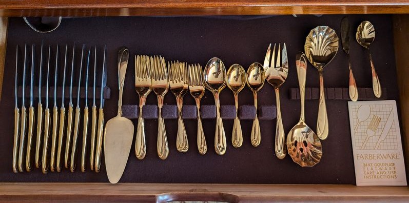 Farberware Gold Flatware Set, Table Linens. Farberware complete 5-piece, service of 12 flatware set with hostess pieces; assort tables linens, incl tablecloths & napkins; assort napkin rings-see photos for quantity & details. Items seen in background not incl.