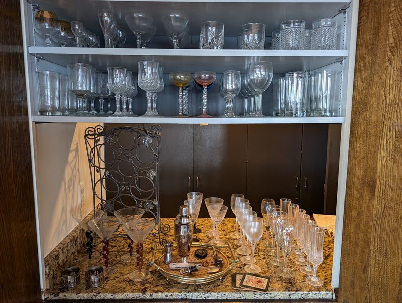 Bar Glasses, Wine Rack, Bartenders' Tools. Several crystal and glass stemware sets; wine rack, 16"Wx8"Dx20"H; Sharper Image bottle opener; Lenon highball crystal glasses; water & wine etched with family name; other related items as seen in photos.