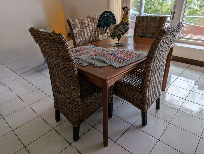Kitchen Table, Wicker Chairs, Décor. vintage table, 57"Lx34"Wx29"H (heavy wear-see photo) with pull out side extensions, ea. 39"; set of 4 wicker Parson's chairs, ea. 19"Wx22"Dx41"H (one with scratch damage-see photo); rooster décor, 19"H; set of 4 placemats.