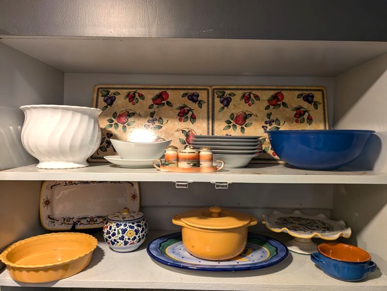 Colorful Kitchenware. Chantal scalloped pie dish, 1 qt; baker with lid, 1.75 qt; Deruta pedestal cake dish; 11"diameter; fish platter, 16"diameter; blue Pyrex glass bowl, 1'diameter; Dansk bowl with grey border, 9"diameter; English "Elegance" bone China bowl, 8.5"diameter x 6.5"H; other related items as seen in photos.