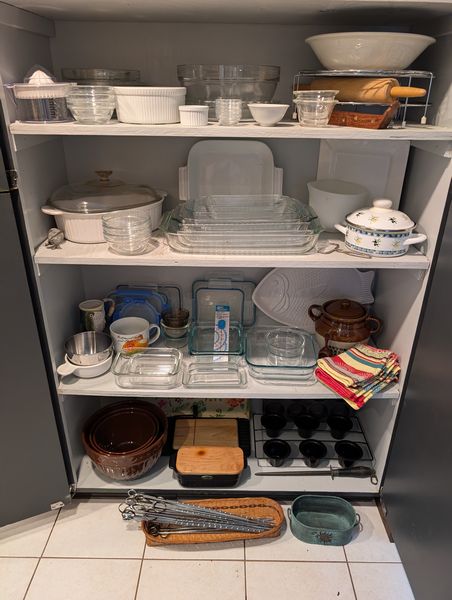 Bakeware, featuring Pyrex and Corning. Covered Corning oval baker, 4L; glass baking dishes, largest, 15"Lx10"W; Cuisinart white baking dish, 9"sq; Sunbeam white mixing bowl, US made; Pyrex glass baker, 8"sq; glass butter dish; brown 3-piece Gatesware bowl set by Laura Gates, largest 11"diameter; cutting boards; muffin tins; bean pot; Royal Doulton covered pit with floral pattern, 7"diameter (matches larger item in lot #23); white Portuguese fish platter, 16"L; other related items as seen in photos.