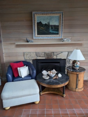 Furniture, Art, Décor, featuring Baker Tables. Blue leather saucer chair with attach cushion, 32"Wx30"Dx32"H; striped upholstered ottoman, 32"Wx22"Dx17"H; Baker coffee table, 3'diameter x17"H & side drum table, 22"diameter x 25"H; framed print of hillside/sailboat, 42"Wx35"H sign Purdy; Asian-style lamp, 25"H; beach-themed décor.