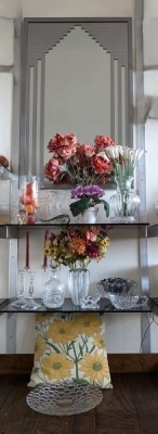 Fine Crystal, Wall Mirror. Glass framed wall mirror, 30"Wx4'H; Orrefors crystal bowl, 10"diameter x5"H with rocks inside; Irena 24 lead crystal decanter, 11"H; Waterford vase, 13"H; Mikasa platter, 15"diameter; pr Oleg Cassini candlestick holders; crystal handled pitcher (has been repaired-see photo); other related items as seen in photos.