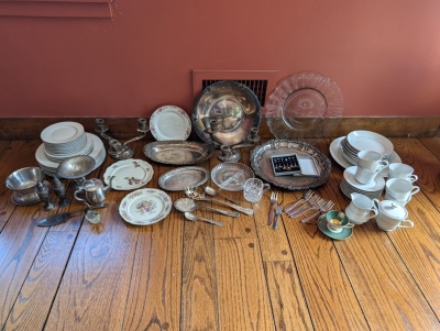 Vintage Silverplate and Porcelain Entertaining. Wilkshire House "Bridal Lace" by Jepieceor dish set (incomplete) with 1'diameter platter; 9"diameter bowl; 10'diameter dinner plate; other pieces; three small plates (one Rosenthal Pompadour; two Bavaria); 24K gold demitasse cup & saucer set; silverplate platter, 14"diameter; round glass platter, 13.5"diameter; small spoon set in box; other related items as seen in photos.