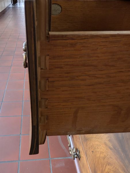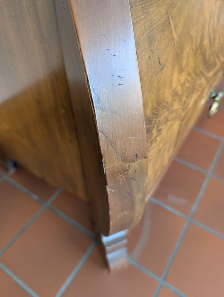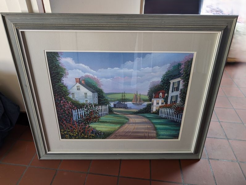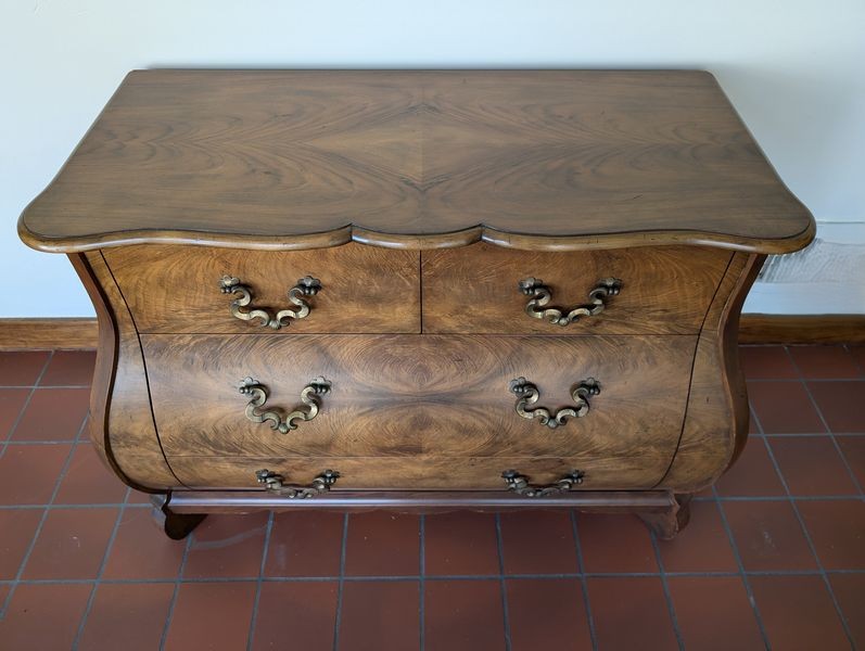 Bombay Chest, Wall Art. Baker Bombay chest (burled wood), 40"Wx20"Dx30"H with three dovetailed drawers (very minor damage to one leg-see photo); signed framed wall art behind glass, 34"Wx29"H.
