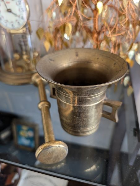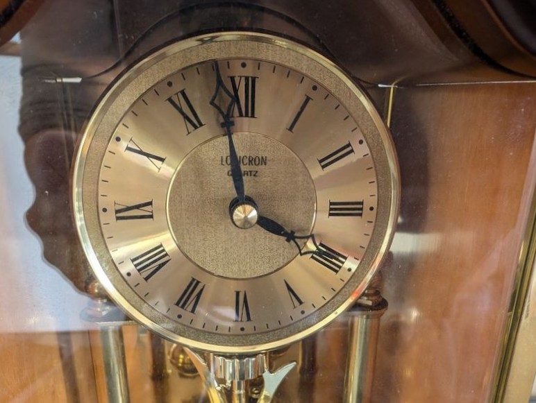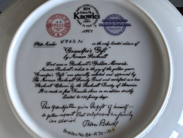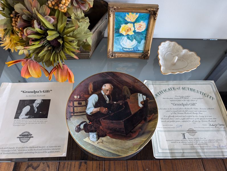 Clocks, Collectibles. Three mantle clocks (see photos for names), ea. approx. 9"H; Asian-style vase, 11"H; brass mortar & pestle; Norman Rockwell collector's plate with auth, 8.5"diameter; other collectibles as seen on shelves.