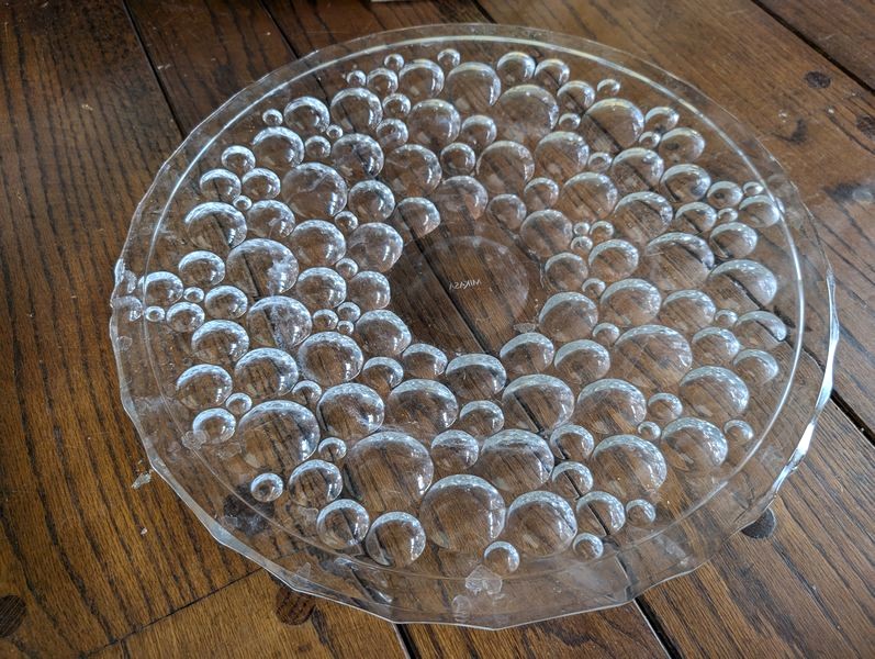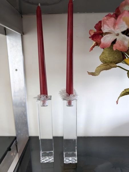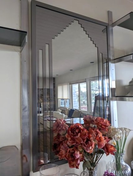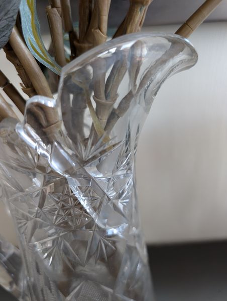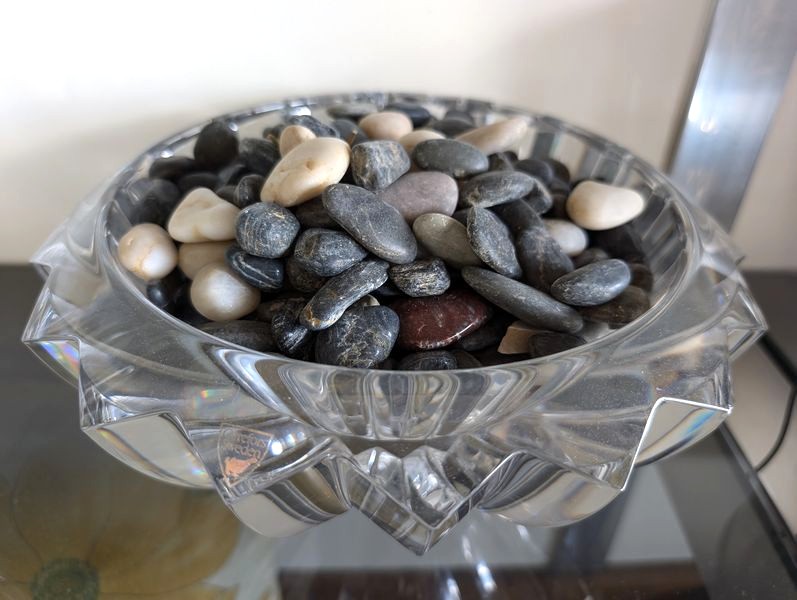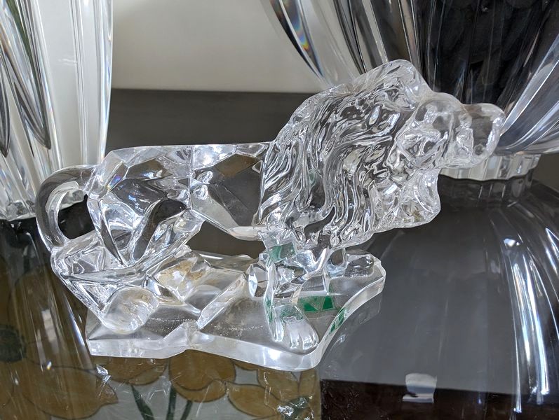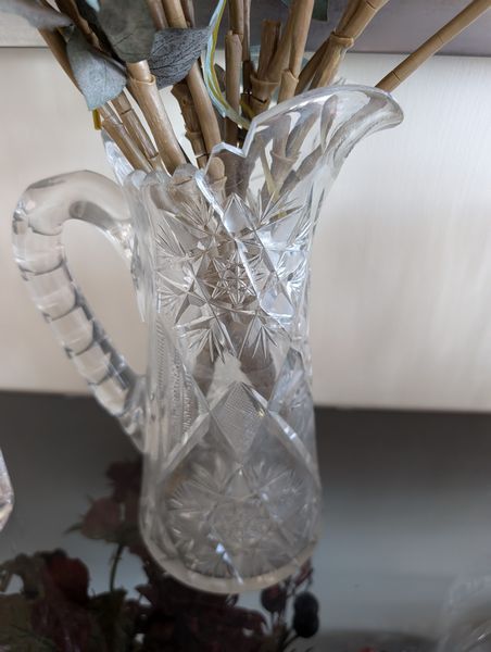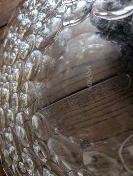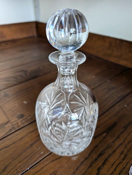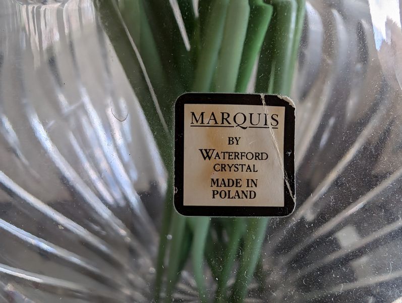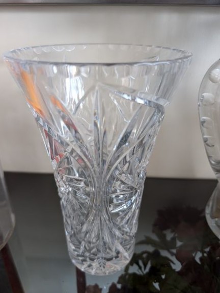 Fine Crystal, Wall Mirror. Glass framed wall mirror, 30"Wx4'H; Orrefors crystal bowl, 10"diameter x5"H with rocks inside; Irena 24 lead crystal decanter, 11"H; Waterford vase, 13"H; Mikasa platter, 15"diameter; pr Oleg Cassini candlestick holders; crystal handled pitcher (has been repaired-see photo); other related items as seen in photos.