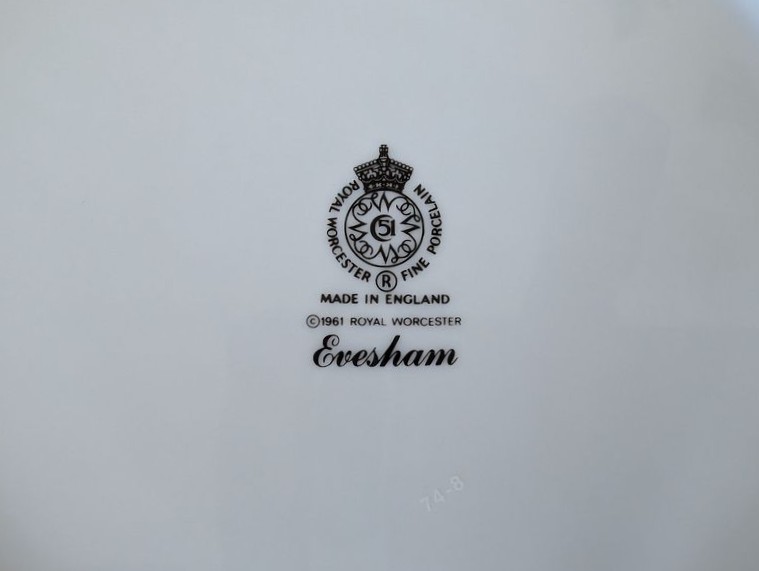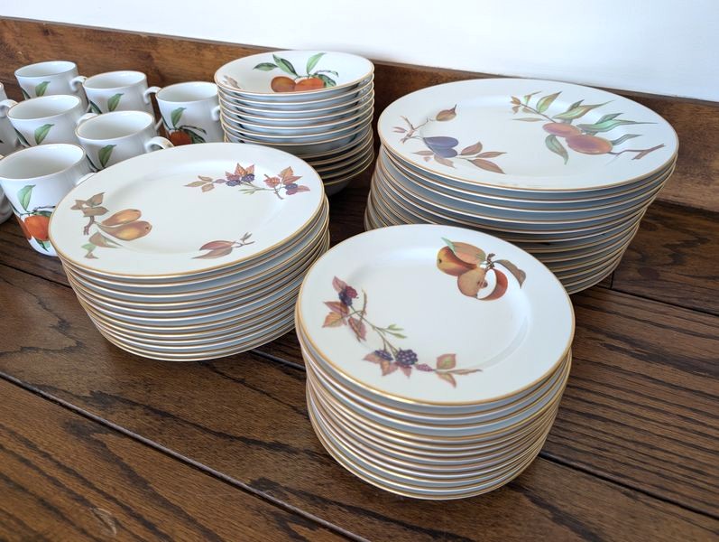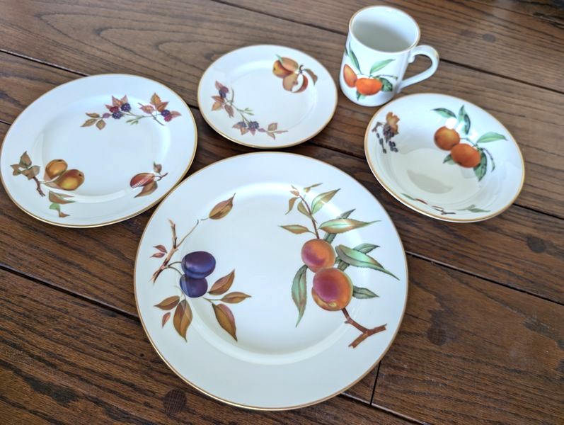 Evesham Dish Set. Evesham Royal Worcester complete dish set, 5-piece, service of 12 with 10"diameter dinner plate. See photos for details. Matches ent pieces in lot #14.