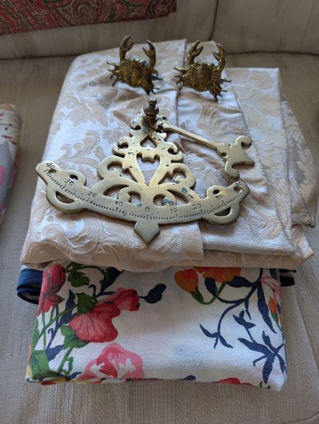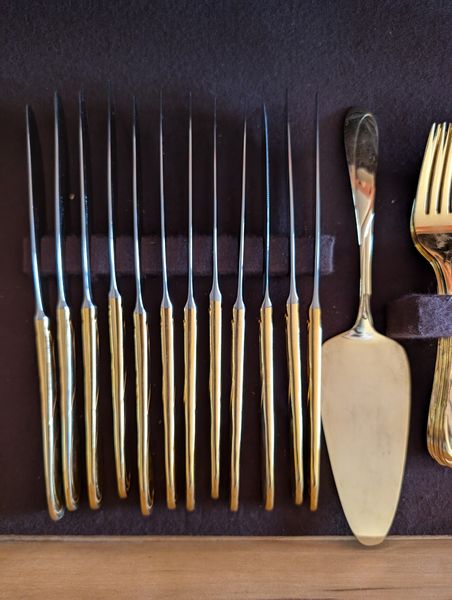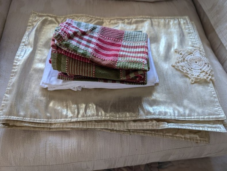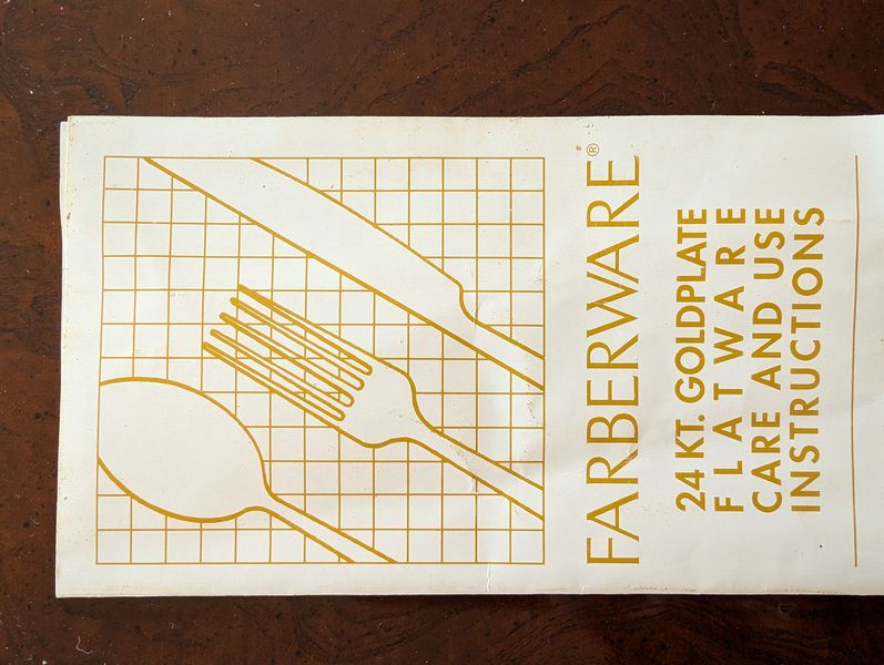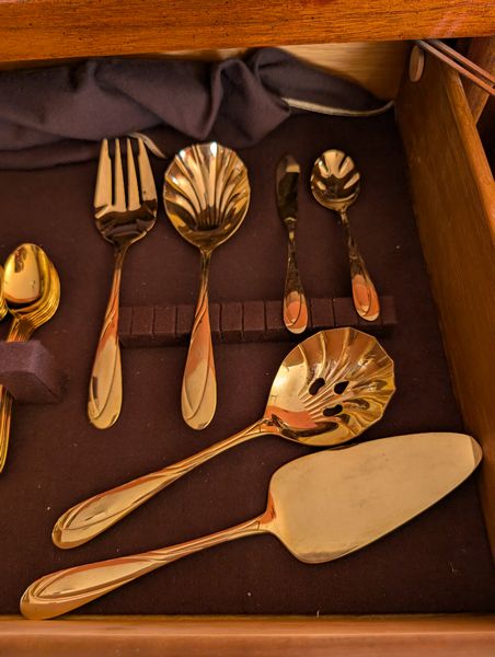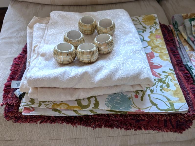 Farberware Gold Flatware Set, Table Linens. Farberware complete 5-piece, service of 12 flatware set with hostess pieces; assort tables linens, incl tablecloths & napkins; assort napkin rings-see photos for quantity & details. Items seen in background not incl.