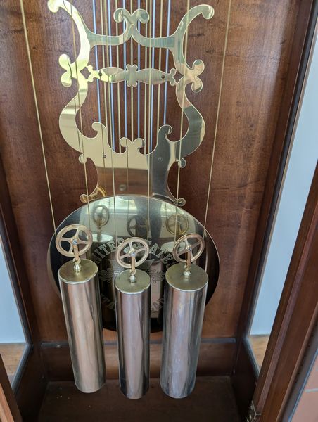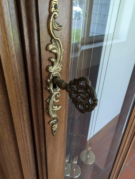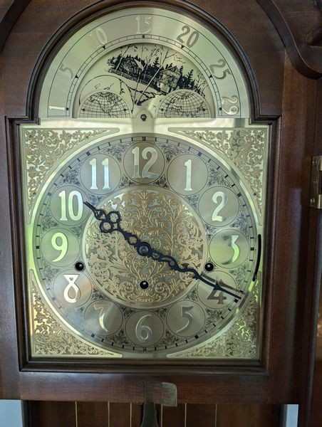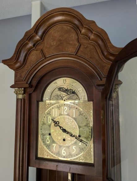 US Made Grandfather Clock. Grandfather clock in wood case with brass face, pendulum & weights, US-made, 22"Wx1'Dx80"H. Located by the front door.
