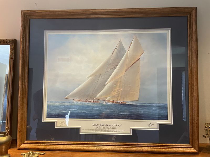 Baker Chest, Chair, Décor. Baker 4-drw chest; woven chair; sign America's Cup picture; copper sailboat; Charles Morgan print; brass beach décor; other related items as seen in photos, incl throw blankets & pillows. Located on the second floor.