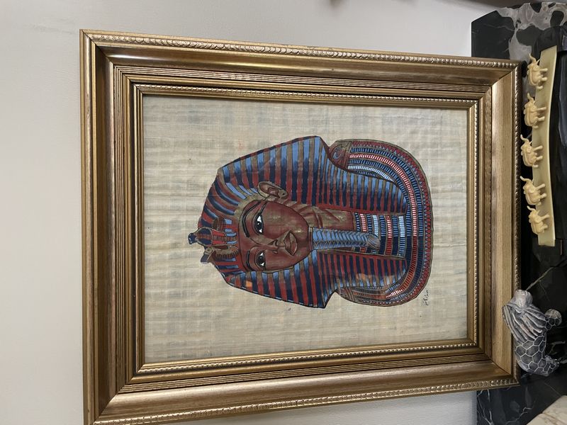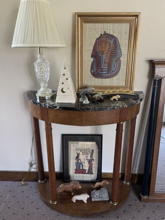 Baker Entry Table, Mirror, Lamp, Décor. Baker demilune table; Baker wall mirror; crystal table lamp with shade; Egyptian art & décor; animal décor; other related items as seen in photos. Located on the second floor.
