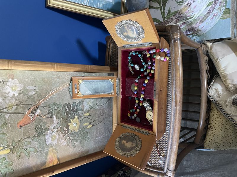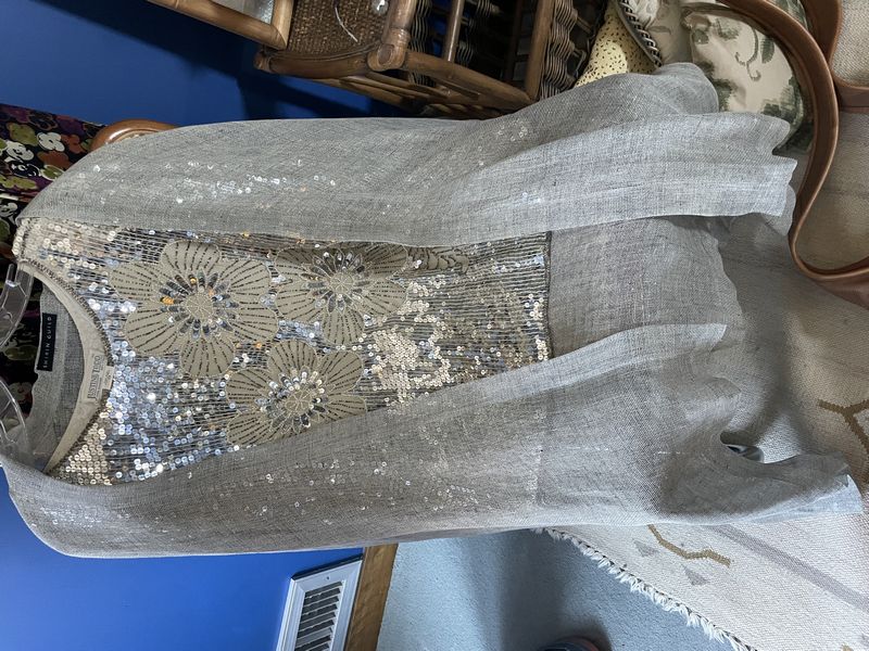 Women's Boutique, featuring Ugg. Chrome chair with cane seat; Liz Claiborne dress; Ugg handbag; Asian-style print; Gustine Todd jacket & sequin top; 5'x7'area rug; vintage coat; costume jewelry; hat box set; mini pillows. Located on the second floor.