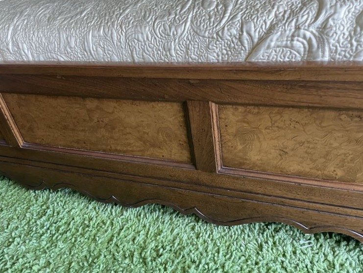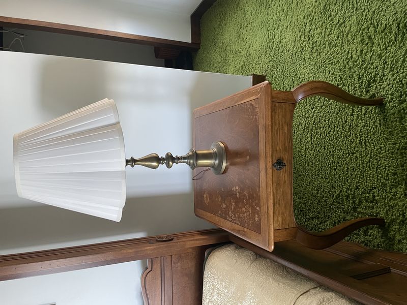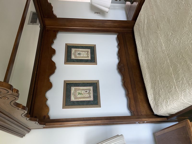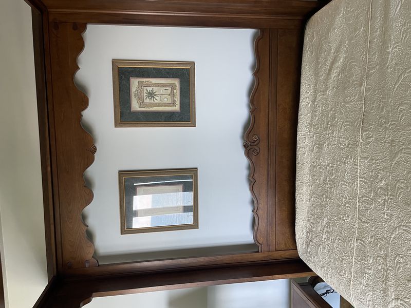Wood Canopy Bed, Side Tables. Queen bed with two nightstands; brass table lamps with shades; two prints; bedding. Located on the second floor. Bring tools to dismantle and help to safely remove.