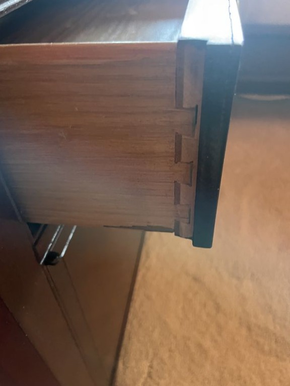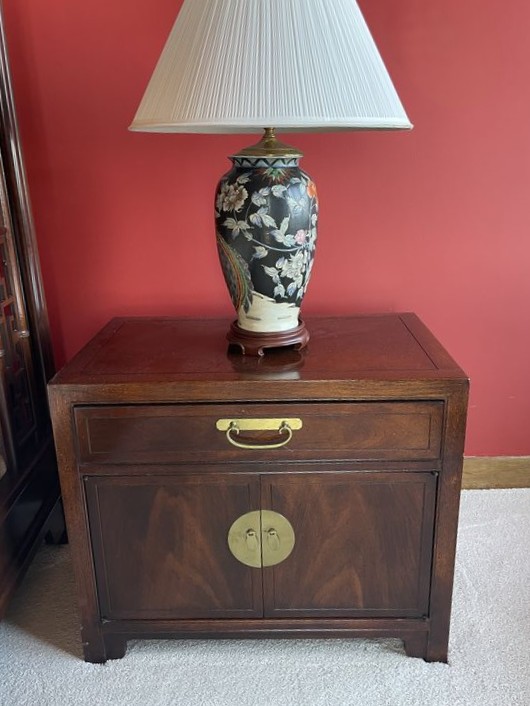 Asian-Style Wood Canopy Bed, Nightstands, Lamps. Queen bed with matching pr nightstands with single dovetailed drawers, brass HW & storage; two table lamps with shades. Matches furniture in lots #38 & #39. Located on the second floor. Bring tools to dismantle and help to safely remove.