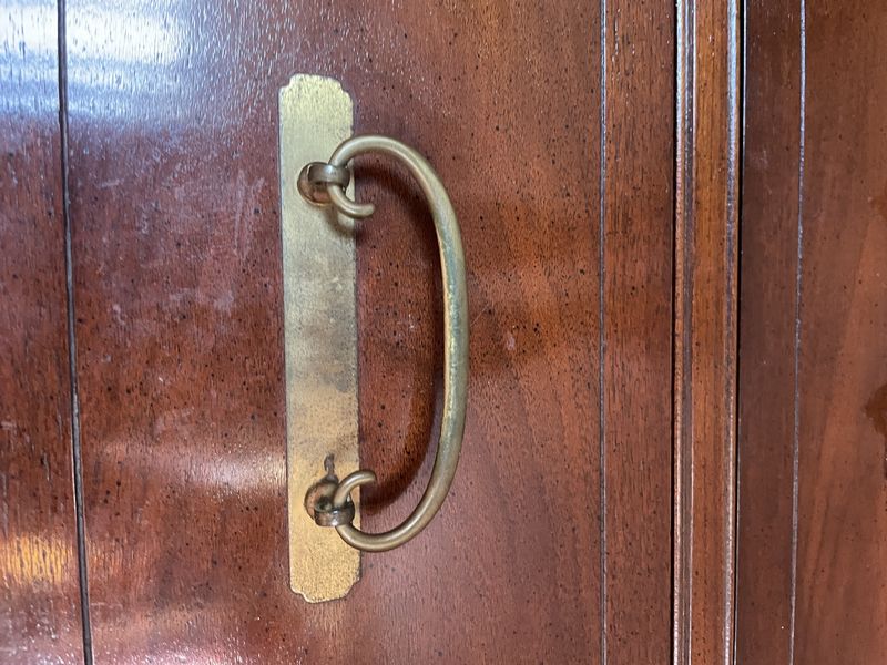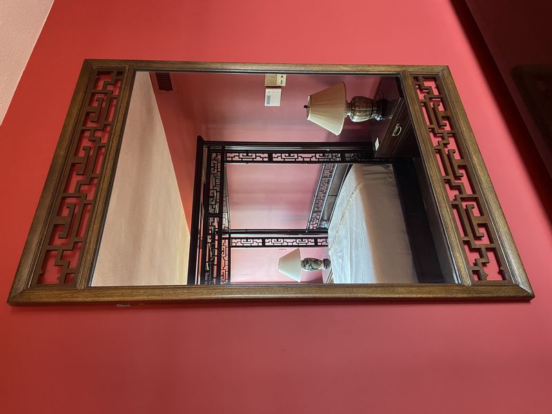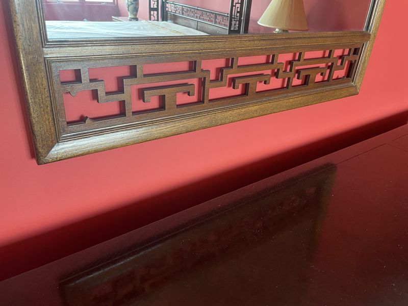 Asian-Style Dresser, Mirror, Throw Rug. Baker nine-drawer dresser with brass HW; matching Baker wall mirror; small area rug. Matches furniture in lots #37 & #39. Located on the second floor. Bring help to safely remove.