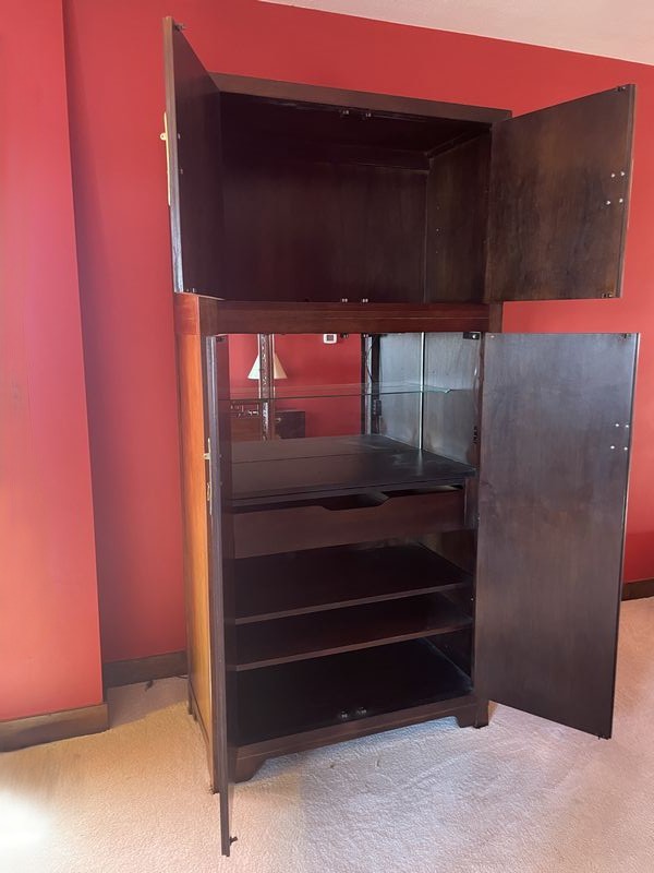 Baker Asian-Style Armoire. Baker armoire with brass HW, inside drawer & mirrored back. Matches furniture in lots #37 & #38. Located on the second floor. Bring help to safely remove.