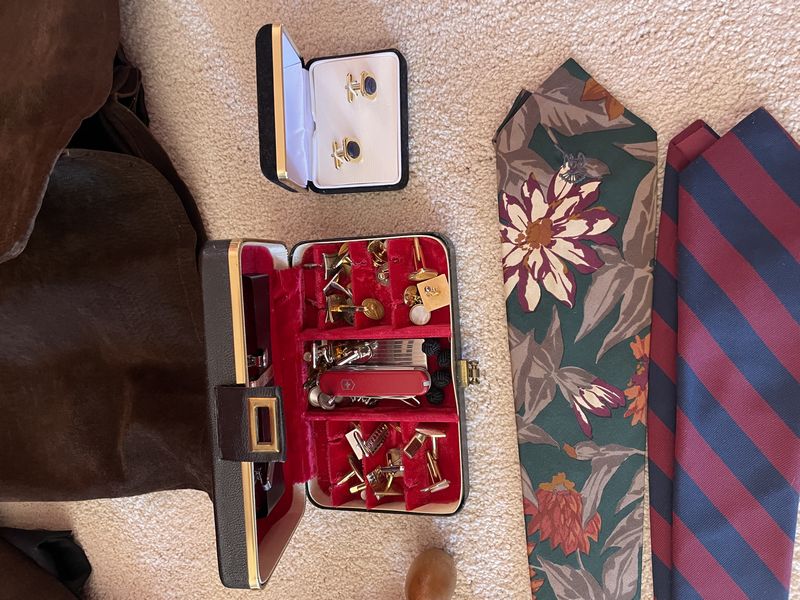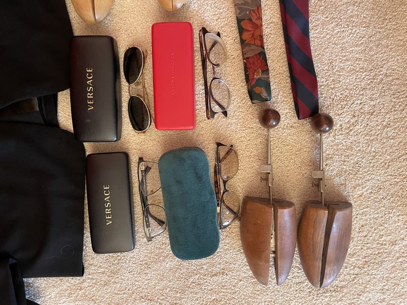 Men's Boutique. Two leather jackets, incl one Claiborne; leather briefcase; Columbia straw hat; Versace glasses; wood shoe forms; ties; other related items as seen in photos. Located on the second floor.