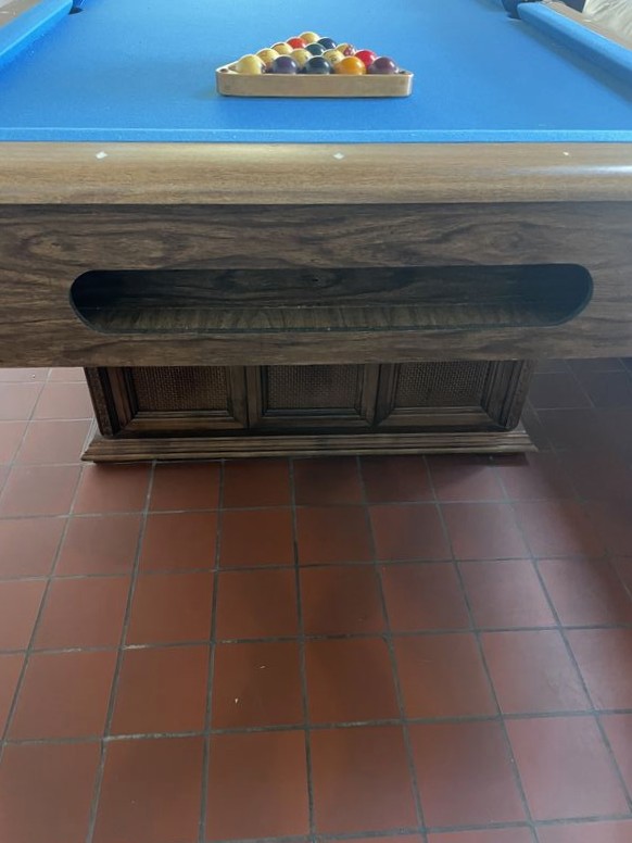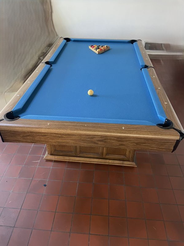 Pool Table. Pool table in light wood with blue felt; pool table cues & balls; optional ping pong table top (damaged) with accessories. Loc on main floor near front door. Must bring help to safely dismantle & remove.